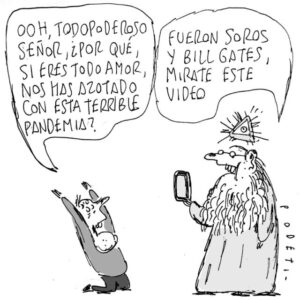Esta implantação não é apenas ideológica, ou seja, não se afirma apenas em sistemas consistentes, mas é acima de tudo um campo de sentidos, de práticas e de critérios alternativos de evidência que se estendem sobre o senso comum. Durante a quarentena da COVID 19, conversas informais, comentários ao passar, postagens, e-mails e chats proliferam ao nosso redor que não são de ativistas convencidos, mas de um espaço social que passa por nós. Uma das mais marcantes é a desconfiança da ciência autorizada, que olha com receio para a OMS, para os médicos que recomendam a ASPO, para o uso de máscaras ou para os laboratórios que trabalham com a vacina. A desconfiança varia. Esses grupos podem suspeitar que o vírus é falso, assumir sua realidade mas afirmar que é exagerado, acusar Bill Gates ou “os políticos” de tudo, alegar que a cloroquina é o remédio e os laboratórios estão mantendo segredo para ganhar dinheiro, ou alegar que os testes de vacina serão um experimento prejudicial para os seres humanos. Tal desconfiança só raramente é inspirada por uma lógica estritamente religiosa, o que não quer dizer que não possa aparecer em algum tipo de ideia apocalíptica sobre a origem da pandemia ou em práticas mágicas sobre cura. A desconfiança na ciência oficial não é a vingança da religião, pelo contrário, é a crise das instituições incluindo a religião.