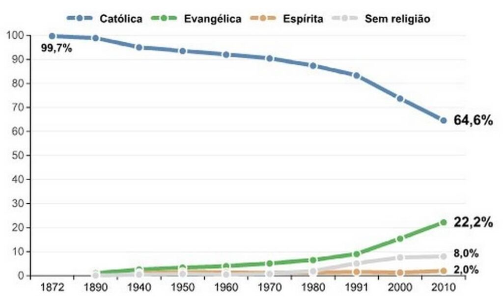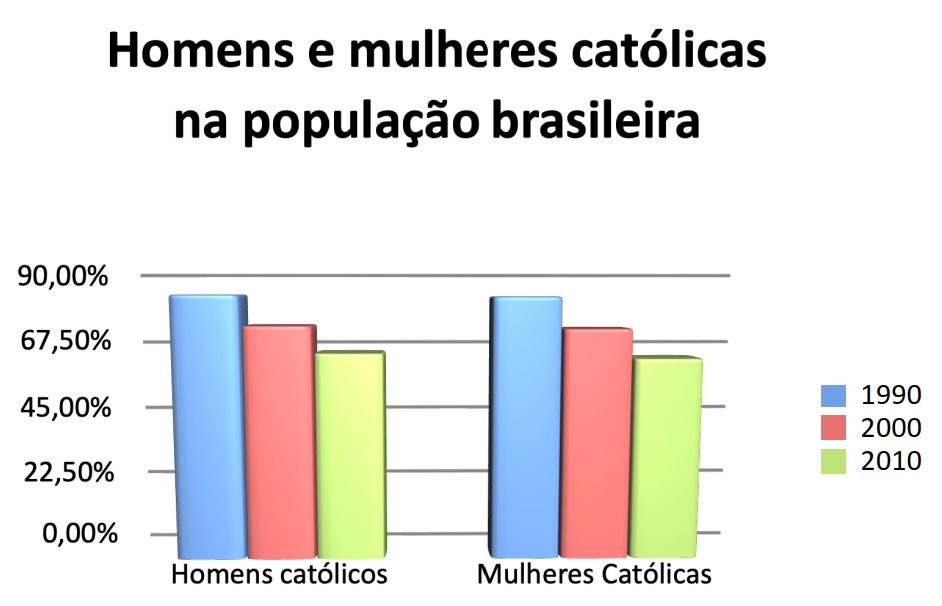 A série histórica dos censos do IBGE confirma a queda progressiva do número de católicos no Brasil.  Se tomarmos como referência os censos de 1990, 2000 e 2010 perceberemos um contínuo decréscimo de quase 10% a cada censo. Neste sentido, um primeiro aspecto a destacar é que, embora a diminuição dos católicos seja constante, desde o primeiro censo no Brasil, em 1872, somente em 2010 o número absoluto de católicos diminuiu, passando de 125,5 milhões de pessoas em 2000, para 123,3 milhões. Ou seja, uma perda de 2,2 milhões de fiéis