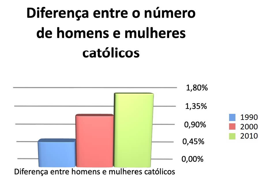 Esta mesma tendência de masculinização observa-se quando se relaciona o número de homens e mulheres no interior do catolicismo. Até a década de 1990, esta diferença era favorável às mulheres, ou seja, 0,6 homens católicos para cada mulher católica. Em 2000 a relação se inverte, passando a ser de 1,2 homens para cada mulher católica. Esta diferença se aprofunda em 2010, quando temos1,7 homens para cada mulher.