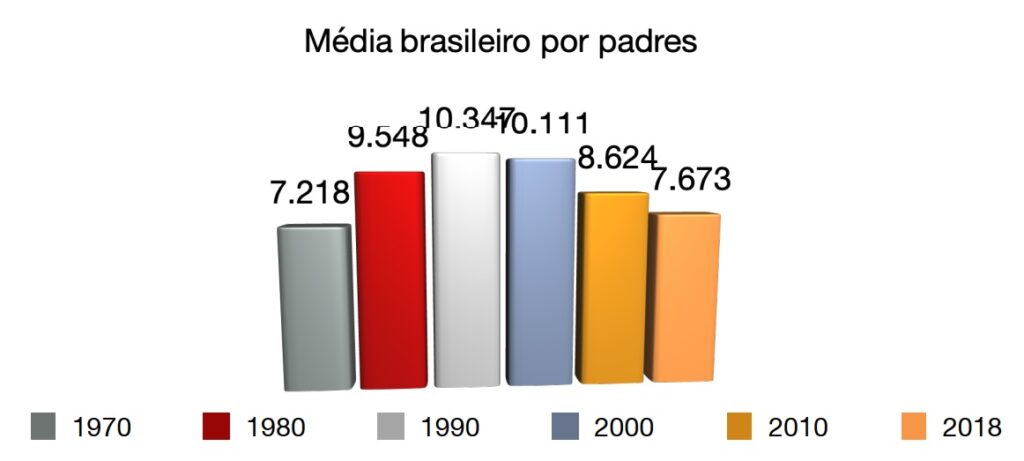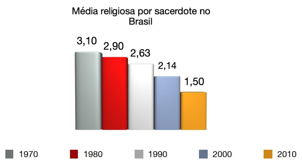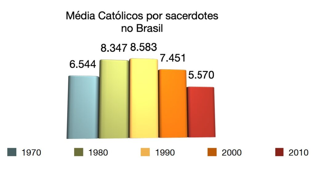 Com relação ao número de sacerdotes, o aumento é ainda mais expressivo. A partir da década de 1980, até 2010, o número de sacerdotes passou de 12.688 para 22.119, um aumento de mais de 60%. Por outro lado, quando se relaciona o número de habitantes por sacerdotes no Brasil, ainda que o quadro apresente alguma variação, a tendência à diminuição do número de habitantes por sacerdote é um dado que parece se confirmar no horizonte histórico das próximas décadas. Em 1970, havia 7.114 habitantes por sacerdote. Nas décadas seguintes, de 1990 a 2000, o número de habitantes por sacerdote aumenta, chegando, em 2000, a 10.123. No entanto, em 2010, quando o número absoluto de católicos diminui, esta proporção cai significativamente, passando a ser de 8,624 habitantes por sacerdote. Um outro conjunto de dados refere-se à proporção de sacerdotes pelo número de católicos. O que segue a mesma tendência relativa ao número de habitantes por sacerdotes. Assim, se em 1980, havia 8.347 fiéis para cada sacerdote, em 2010, este número passou para 5.570.