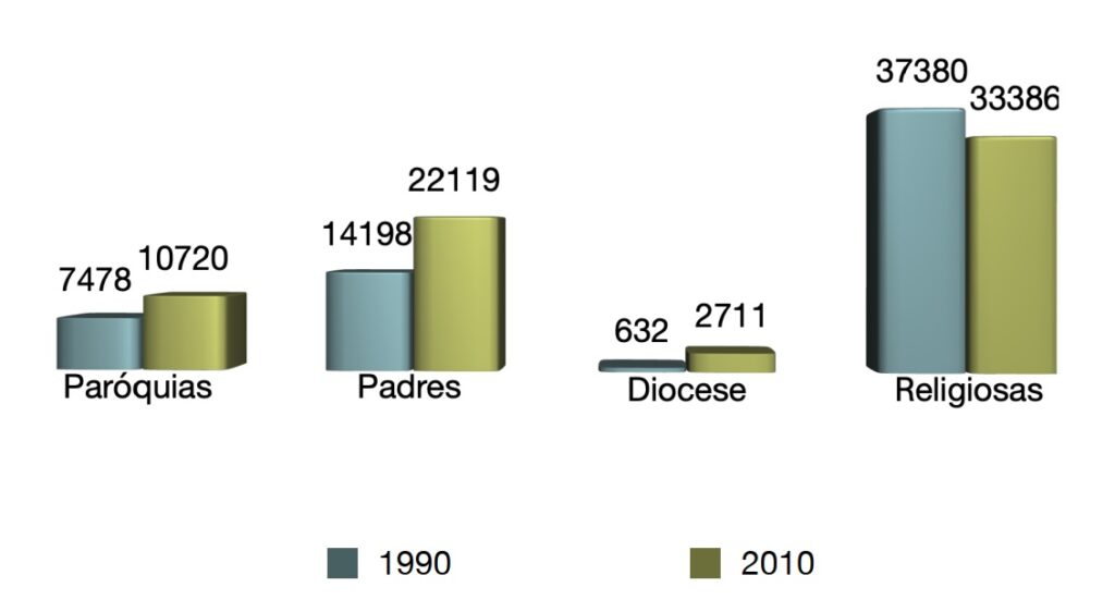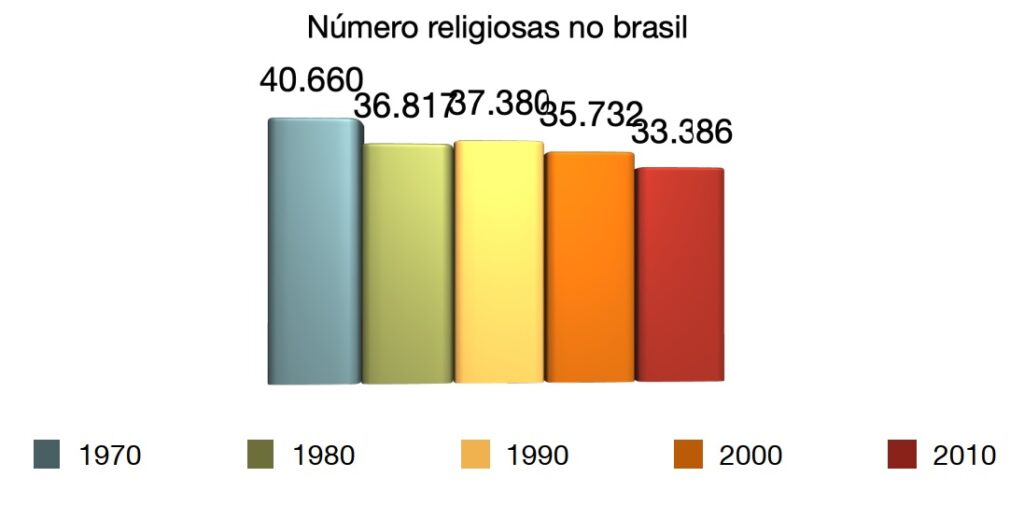 Um último aspecto a destacar diz respeito ao número de religiosas e sua relação ao número de sacerdotes. Ou seja, num intervalo de vinte anos (1990 a 2010), há um crescimento no número de sacerdotes e uma diminuição significativa no número de religiosas. Ou seja, enquanto o número dos agentes de pastoral masculinos aumenta, o das agentes femininas diminui. Uma tendência que se inicia em 1970 e que se torna constante nas décadas seguintes, com pequenas variações. Em 1970 havia 40.660 religiosas no Brasil. Em 1980, este número cai para 36.817, voltando a crescer minimamente em 1990, quando o número de religiosas passa a ser de 37.380. Nas duas décadas seguintes, o número de religiosas volta a diminuir, sendo 35.732 em 2000 e 33.386 em 2010. Em termos percentuais, a relação de sacerdotes para religiosas também mostra uma crescente vantagem dos sacerdotes em relação às religiosas. Em 1970 havia 3,1 religiosas para cada sacerdote. Em 1980 esta proporção era de 2,9, em 1990 de 2,6, em 2000 de 2,1 e em 2010 de 1,5 religiosas para cada sacerdote.