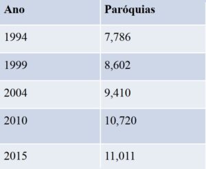 O segundo aspecto que sobressai das pesquisas que vimos cotejando, é que justamente no período em que se acelera a diminuição dos católicos, aumenta significativamente o número de paróquias. Tomando como referência a década de 1990, observamos que o número de paróquias passou, neste período, de 7.786 para 10.720. Ou seja, um aumento de quase 40%.