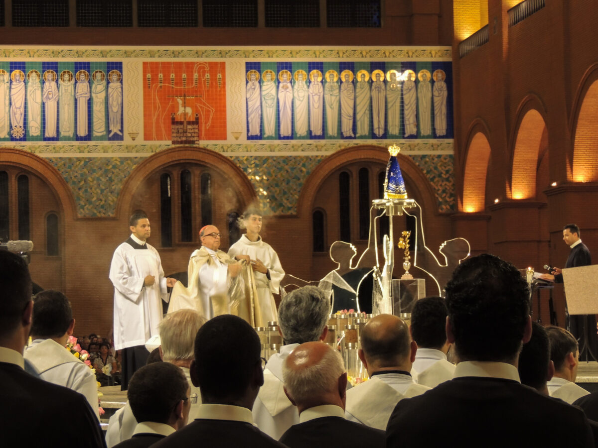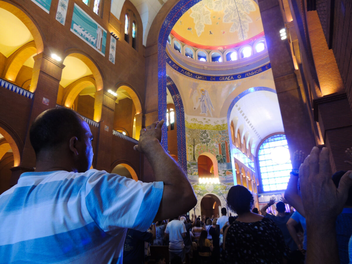 Para melhor contextualizar, a pesquisa de campo foi desenvolvida principalmente entre 2015 e 2019. Nesse período de cinco anos, e com esse suporte, fiz uma série de viagens para o Santuário Nacional de Aparecida, no interior de São Paulo. Interessado no contínuo processo de construção da Basílica, como explorarei mais adiante, o meu foco das pesquisas foi, por um lado, acompanhar presencialmente todas as cerimônias religiosas de inauguração das obras em andamento na igreja. Mas não só isso. A Basílica de Aparecida teve sua primeira pedra lançada no ano de 1955 e, desde então, tanto as obras não pararam como não há uma previsão para o seu fim, o que me levou a fazer uma série de pesquisas em arquivos, tanto em Aparecida como no Vaticano, para uma compreensão mais ampla da trajetória desse prédio.