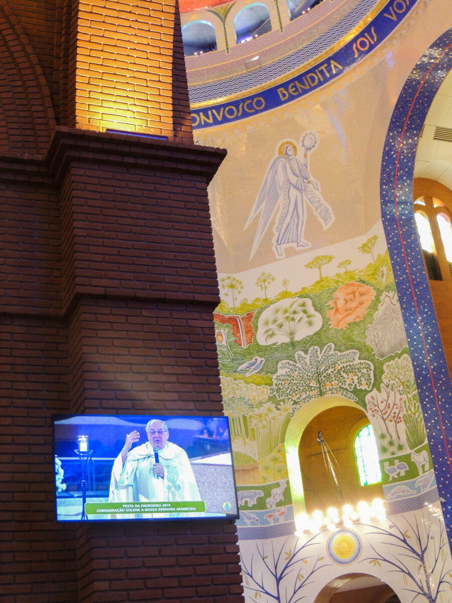 Já no capítulo 06 – “Casa da mãe, família dos devotos” – demonstro como é que o uso e a construção do templo, concomitante ao novo projeto artístico contratado, buscam transformar a igreja em uma casa materna. Faço isso ao abordar analiticamente a campanha de arrecadação de fundos criada para a sua construção, que até então dependia de doações voluntárias e esporádicas. Na campanha de revestimento da cúpula central da igreja, entre outras, exploro como é que a casa, enquanto categoria antropológica, é essencial para entender a religiosidade praticada naquele local através da ação pastoral. Nessa proposta levada a cabo pelo clero, com destaque para a liderança de Dom Darci Nicioli, arcebispo que protagonizou as mudanças administrativas, certo olhar empreendedor passa a ser a nova norma que, também alegadamente inspirada no Concílio Vaticano II, visa criar uma comunidade de devotos que se identifiquem enquanto família. Um contraponto conciliatório tanto com as comunidades Eclesiais de Base da Teologia da Libertação como com as comunidades de vivência da Renovação Carismática Católica. Feita enquanto casa de todos os devotos brasileiros, a proposta de casa se confunde tanto com a de corpo católico como com a de nação brasileira.