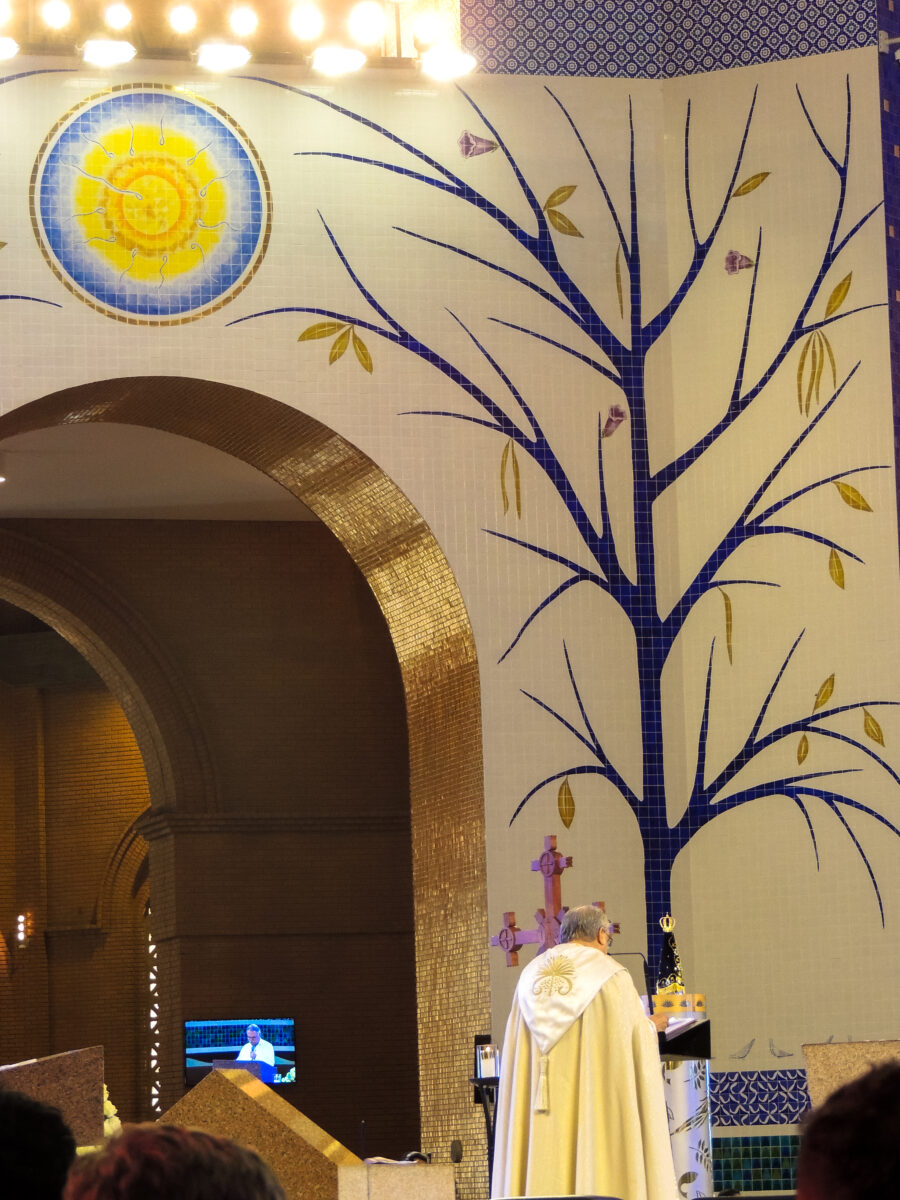 A seção três – “Nave” – aborda a ambientação interna da Basílica, tanto artística como pastoral, que se dá a partir dos anos dois mil com a administração do Cardeal Aloísio Lorscheider. É assim que no capítulo 05 – “A modernização iconoplástica” – trato da contratação de Claudio Pastro, no final dos anos 1990, como artista responsável pela modernização daquela igreja. Na minha avaliação, em um período marcado por certa iconoclastia neopentecostal no país, potencializada pelo episódio do chute na santa em 1995, a solução encontrada pelo artista e o clero é uma iconoclastia neobizantina. Isso marca o novo projeto artístico, com profundas transformações do nicho da santa até ao baldaquino ao redor do altar. Ao ser um especialistas nas normas ditadas pelo Concílio Vaticano II, o artista, ao mesmo tempo em que nega a tradição barroca nacional, tem como referência estética o primeiro milênio da arte cristã, mesclando uma estética bizantina com o que ele chama de arte primitiva, inspirada nas produções indígenas e africanas. Argumento que Pastro consegue criar um modernismo católico.