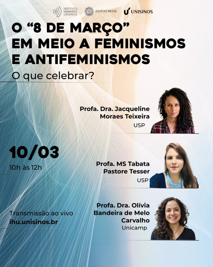 As duas integrantes do LAR, Olivia Bandeira e Tabata Tesser, juntaram-se a Jacqueline Teixeira, a convite do Instituto Humanitas Unisinos – IHU, em uma live transmitida no dia 10 de março de 2026 sobre a data histórica da luta pelos direitos das mulheres, em um contexto no qual muitas delas se reconhecem e se aglutinam a partir da religião, porém posicionando-se como antifeministas.