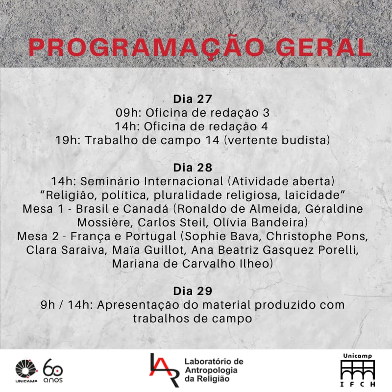 A partir do dia 22 de abril, o Laboratório de Antropologia da Religião (LAR) receberá professores e estudantes franco-canadenses do projeto “Antropologia das Circulações Religiosas África-América-Europa” (ACRAAE). Serão quinze dias de integração, seminário, oficinas e trabalhos de campo. Em suma, atividades colaborativas visando desenvolver nosso projeto de pesquisa e extensão “Religião no Campus”.