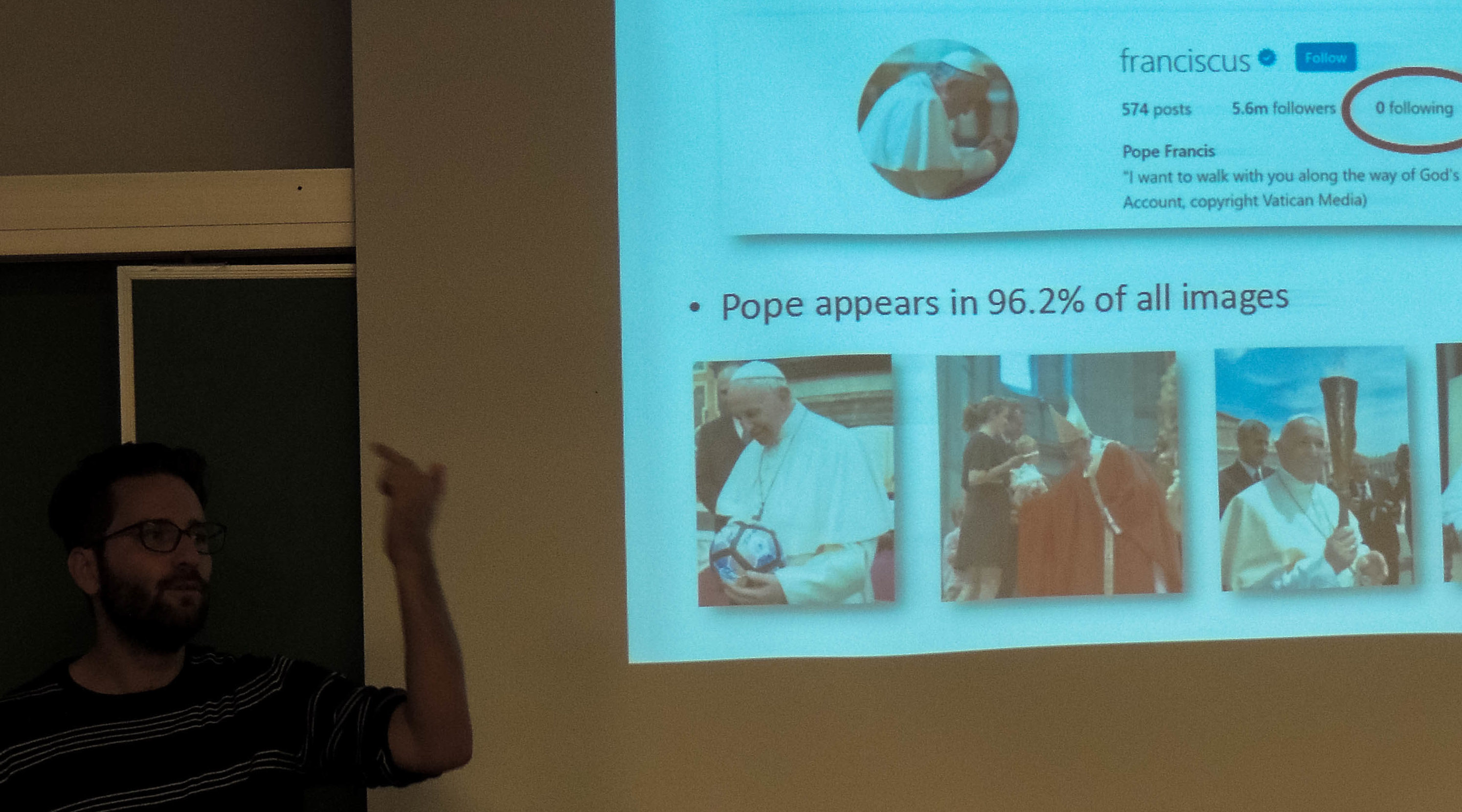 Das interessantes conclusões apresentadas por ele, a presença constante do papa nas fotografias, aparecendo em praticamente 96% das imagens analisadas, chama a atenção logo de partida. Embora seja a figura máxima da Igreja Católica, o perfil segue ainda os padrões de uso próprios à rede social, sendo assim um espaço pessoal onde relatos diários são feitos. Sempre vestido em seu traje oficial, em quase 3/4 das fotos Francisco se encontra no Vaticano, apontando para uma intensa sobreposição entre sua figura e o centro geográfico da instituição religiosa a qual representa.
