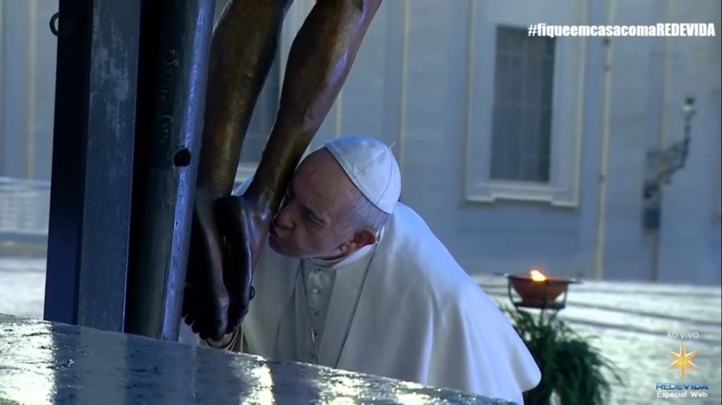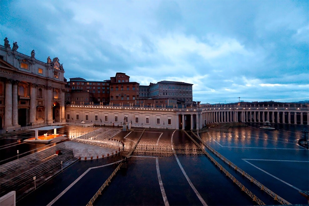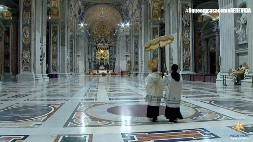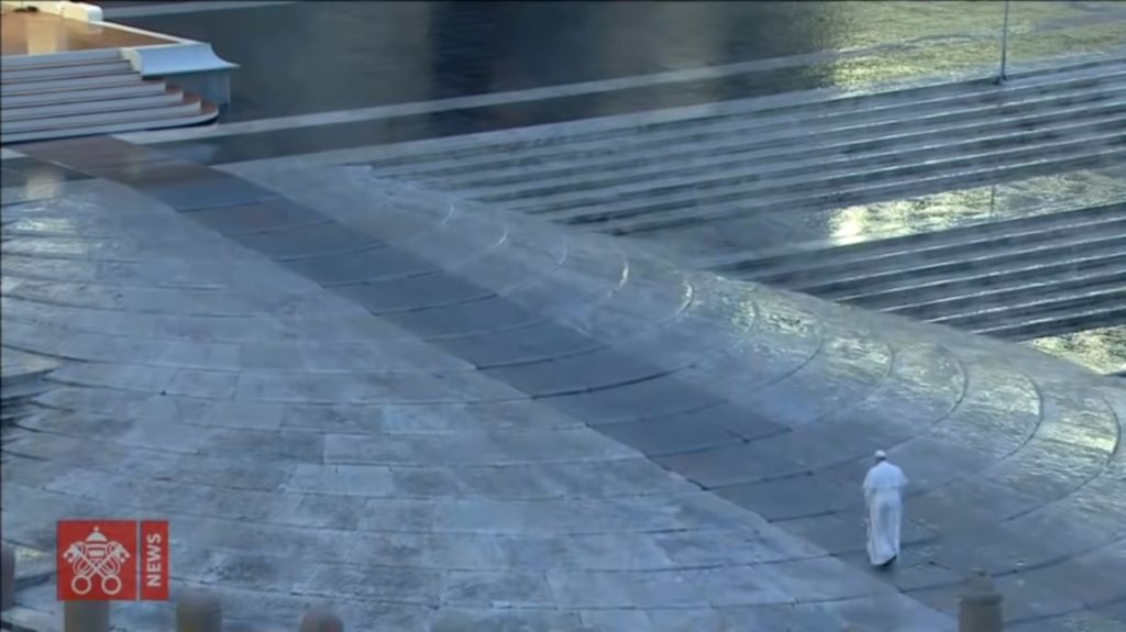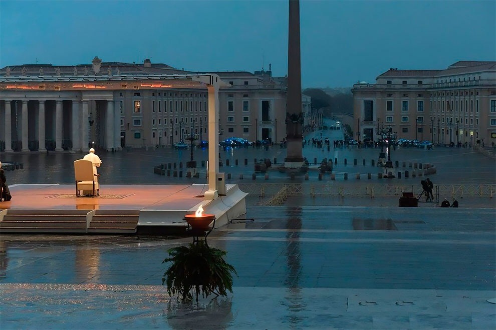 A praça de São Pedro, coração do Vaticano, completamente vazia. Sob uma chuva leve, formando poças que refletem as luzes da cidade, o Papa Francisco caminha sozinho subindo as escadarias até a entrada da Basílica Maior. Na frente dos pilares de mármore, em um palco com luz amarela, o pontífice faz uma celebração em que concede indulgência plenária a todos os católicos. Algo que só deveria acontecer no natal e na páscoa, mas que a pandemia torna extraordinário.