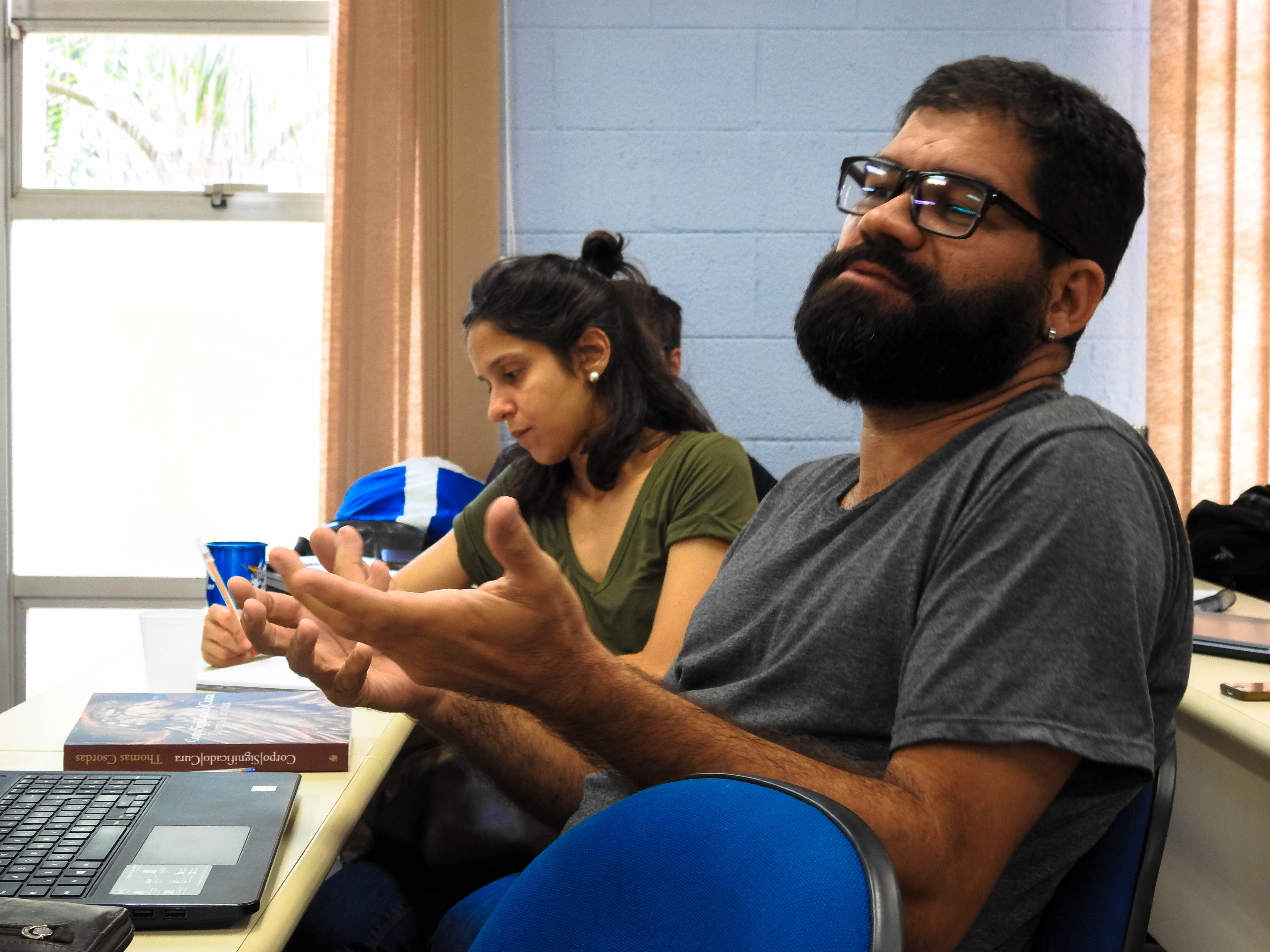 Na tarde de segunda feira (23), participou de uma reunião com o Laboratório de Antropologia da Religião (LAR), na qual contou sobre sua trajetória intelectual e sobre seus interesses de pesquisa.